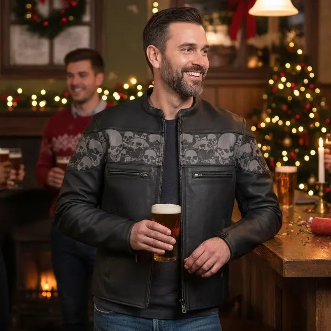 Hot Leathers JKM2002 Men’s Black Biker ‘Reflective Skull' Printed Leather Motorcycle Jacket with Concealed Carry Pockets