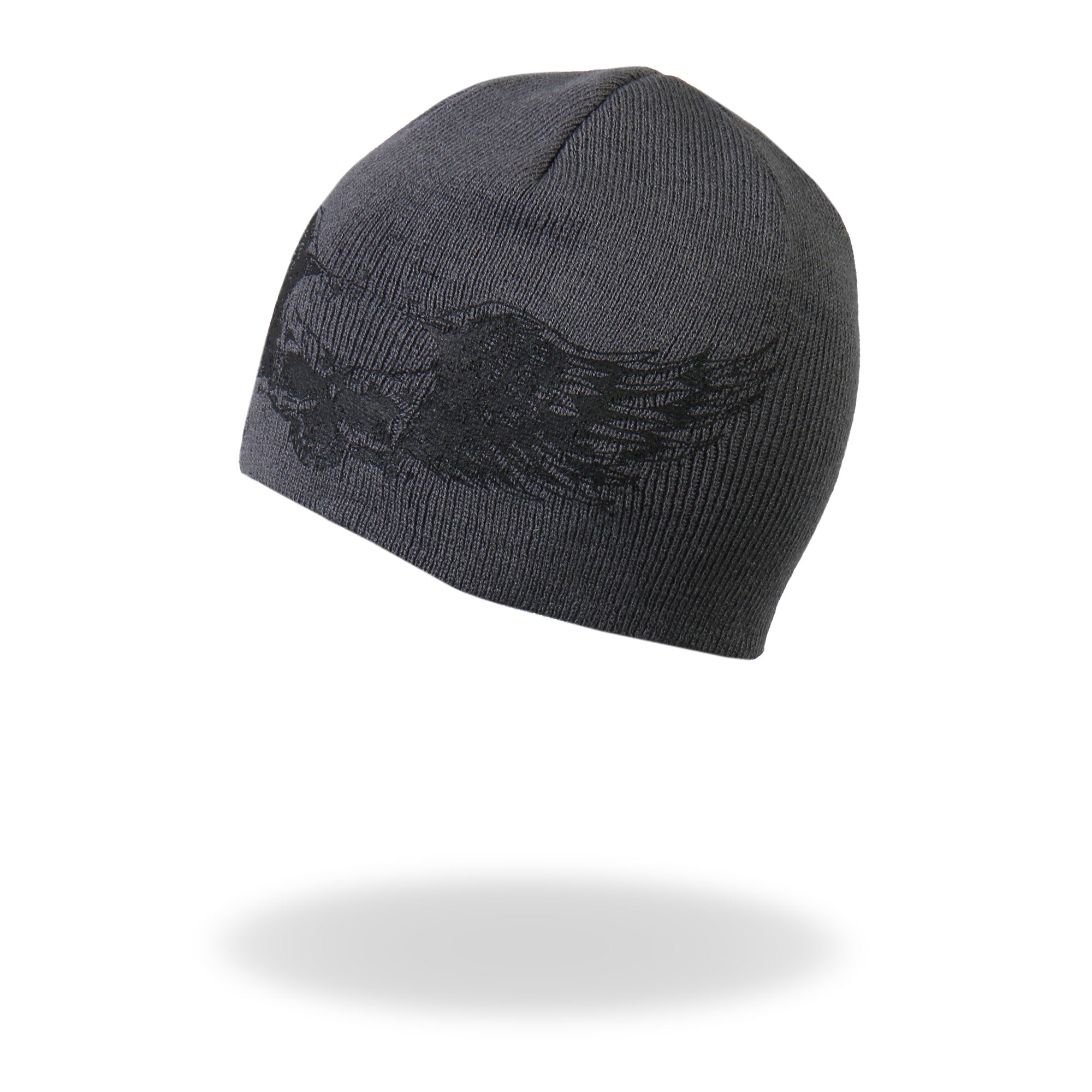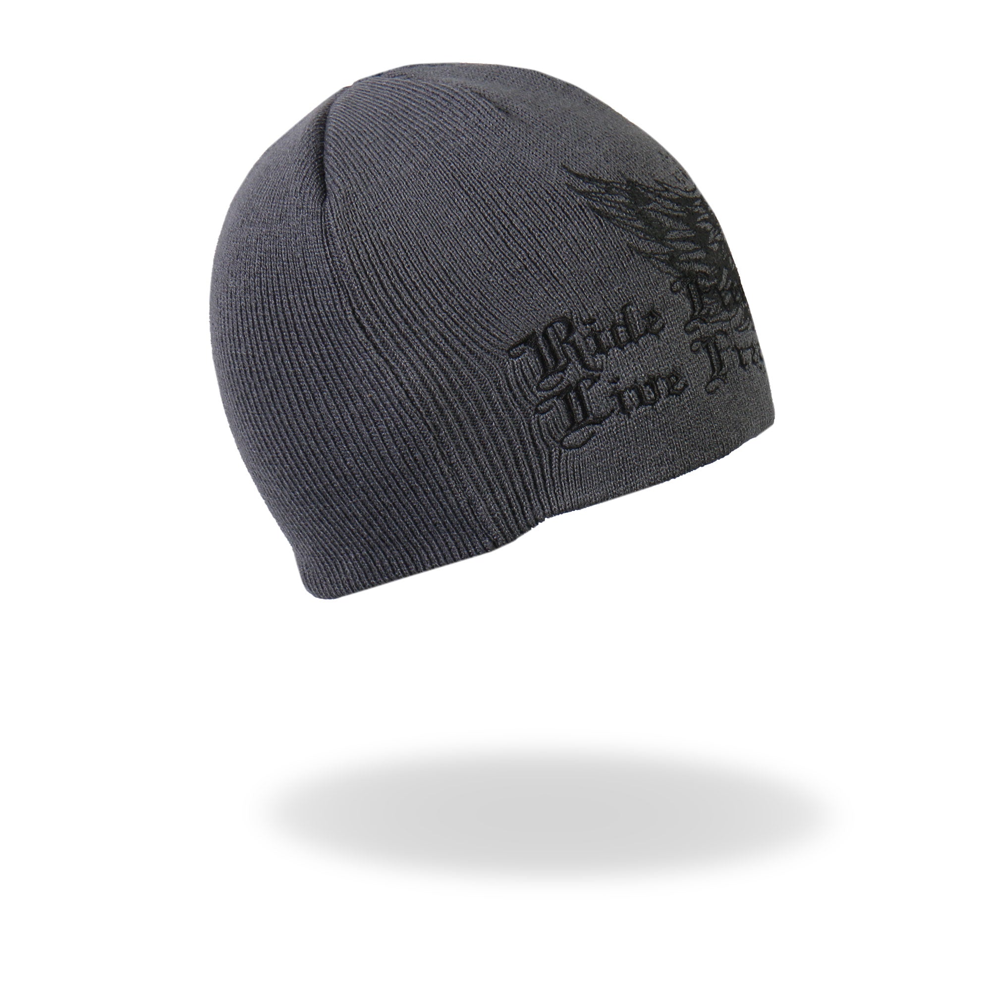 Keep your head warm during cold weather riding with the Skull with Wings Grey Knit Cap! This one size fits all, grey knit cap features an original screen printed and embroidered design of a winged skull and the words "Ride Free, Live Free" in black.