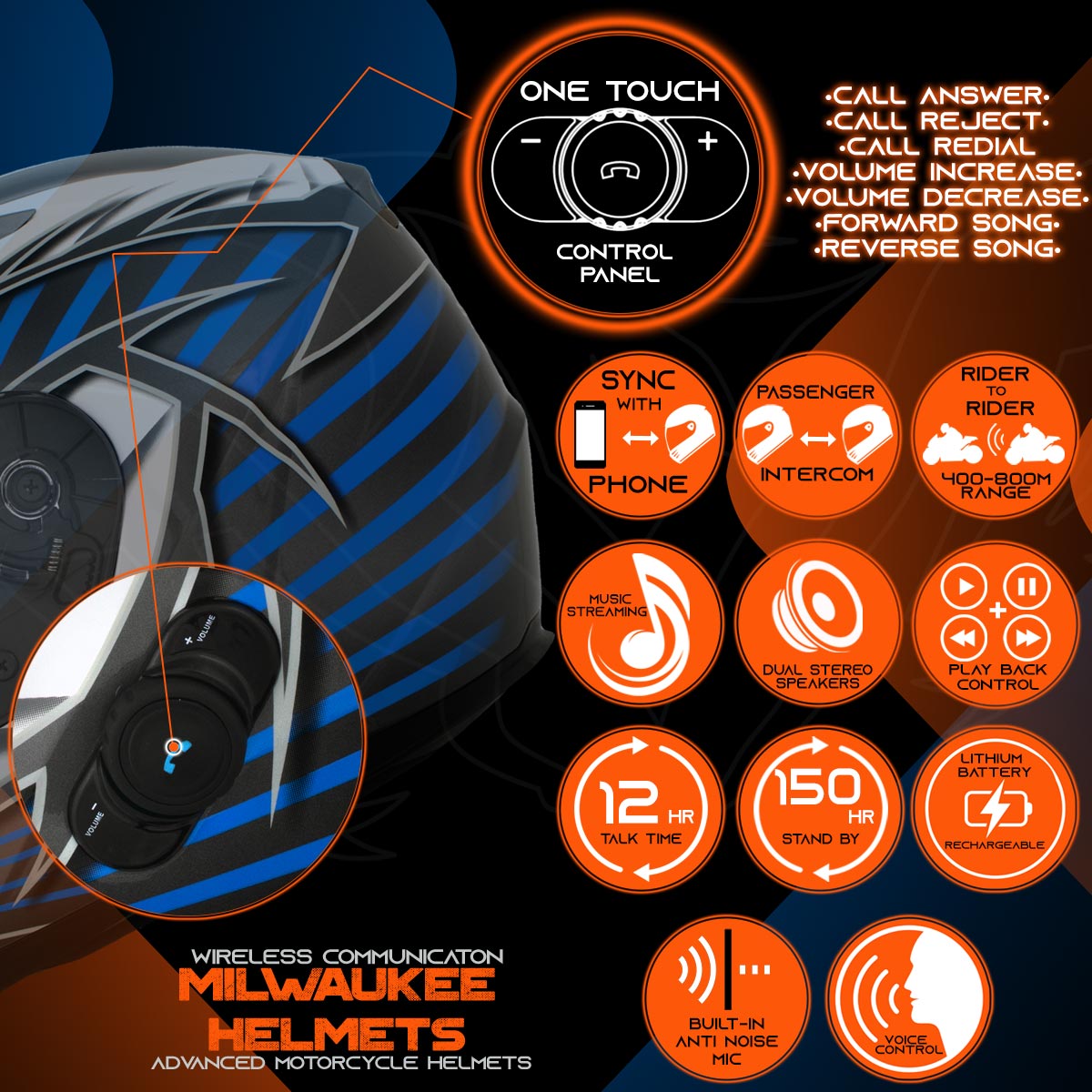 Milwaukee Helmets H512 Titanium and Blue Vector 'Chit-Chat' Black Full Face Motorcycle Helmet with Wireless Communication