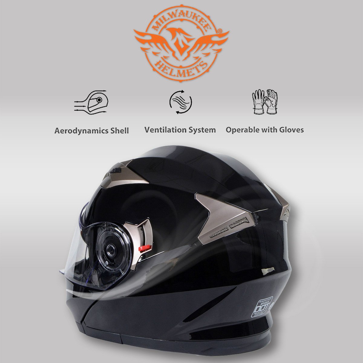 Milwaukee Helmets MPH9806DOT Ionized Gloss Black Advanced Motorcycle Modular Helmet Biker w/ Drop Down Visor
