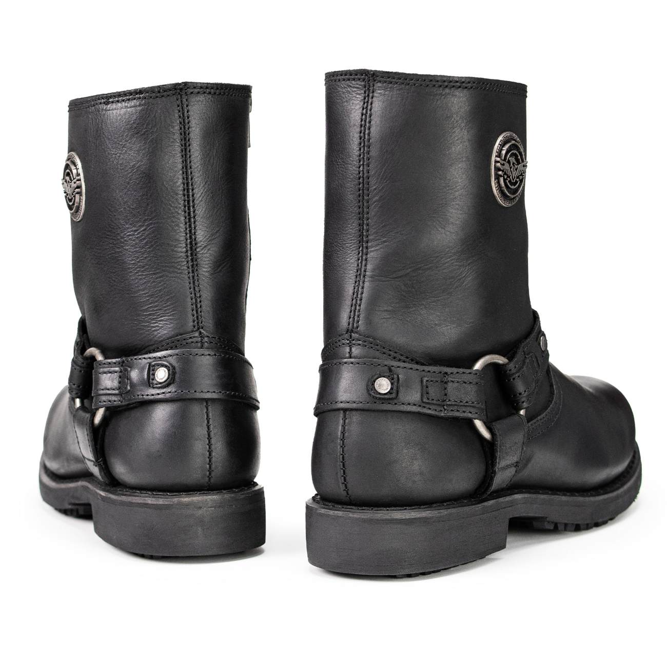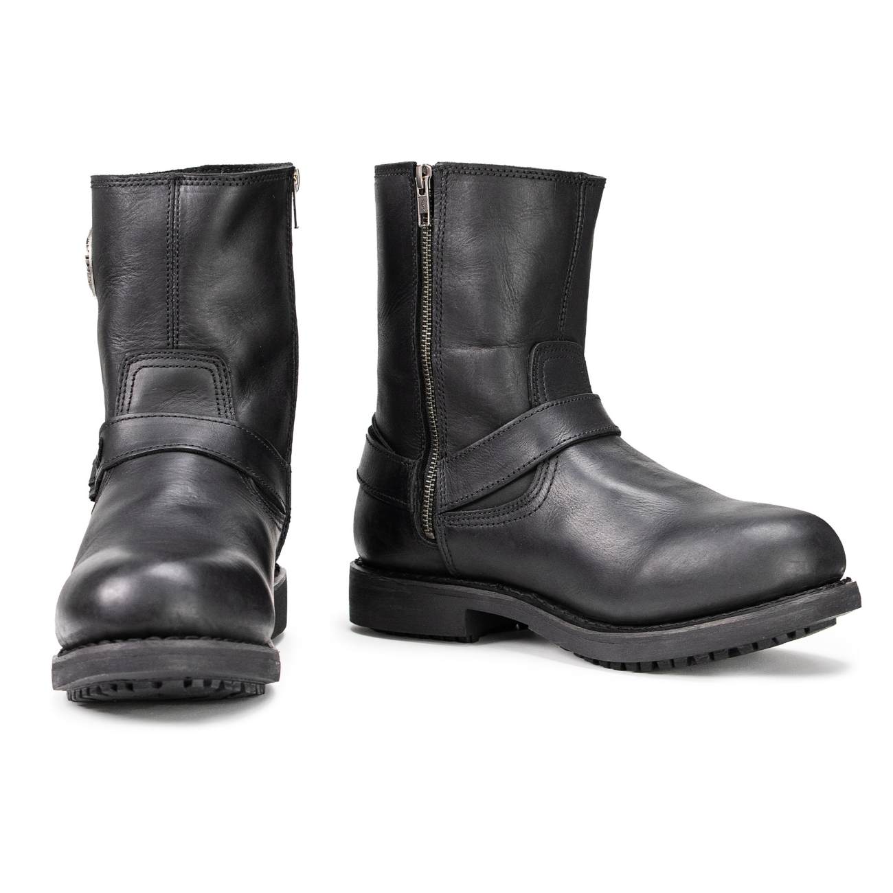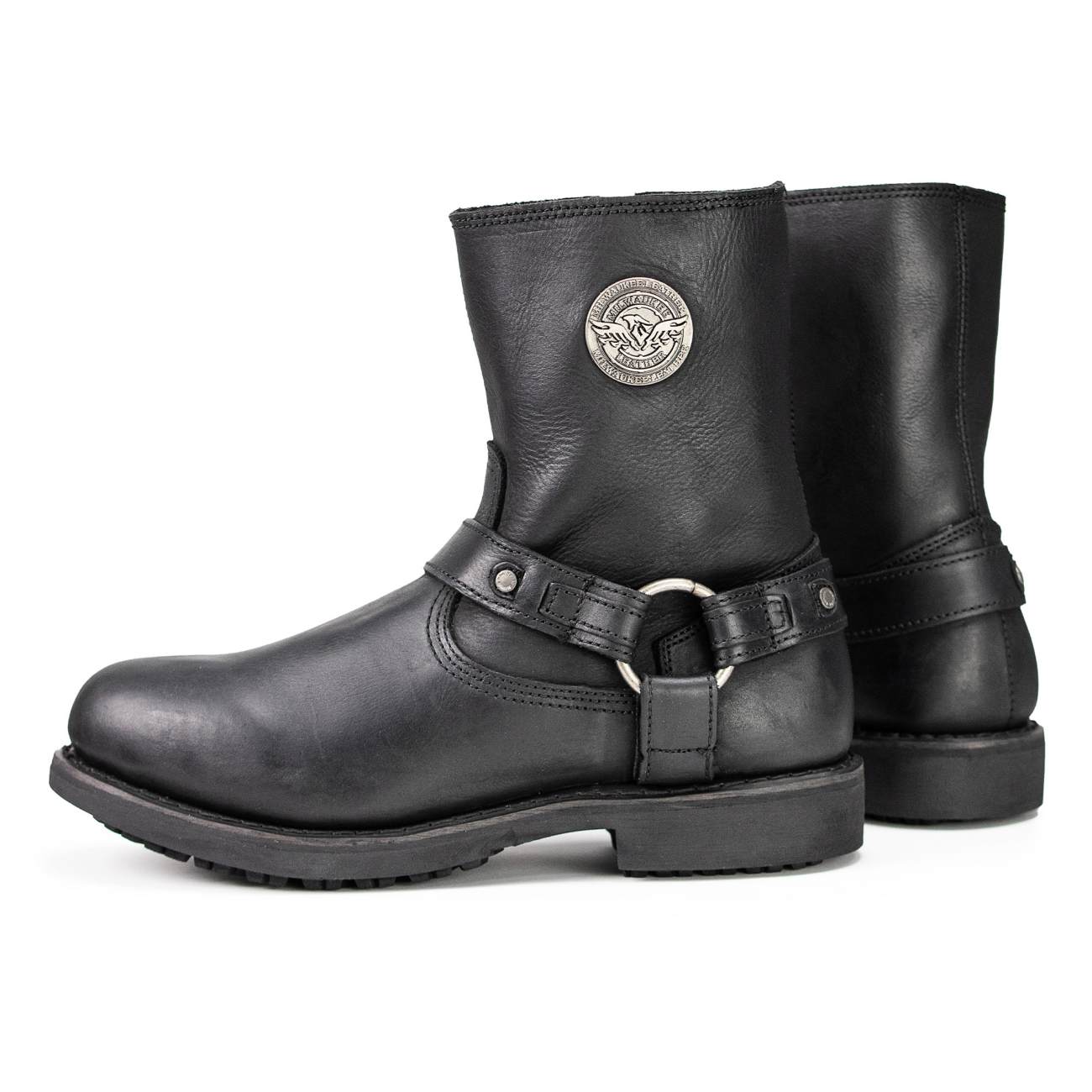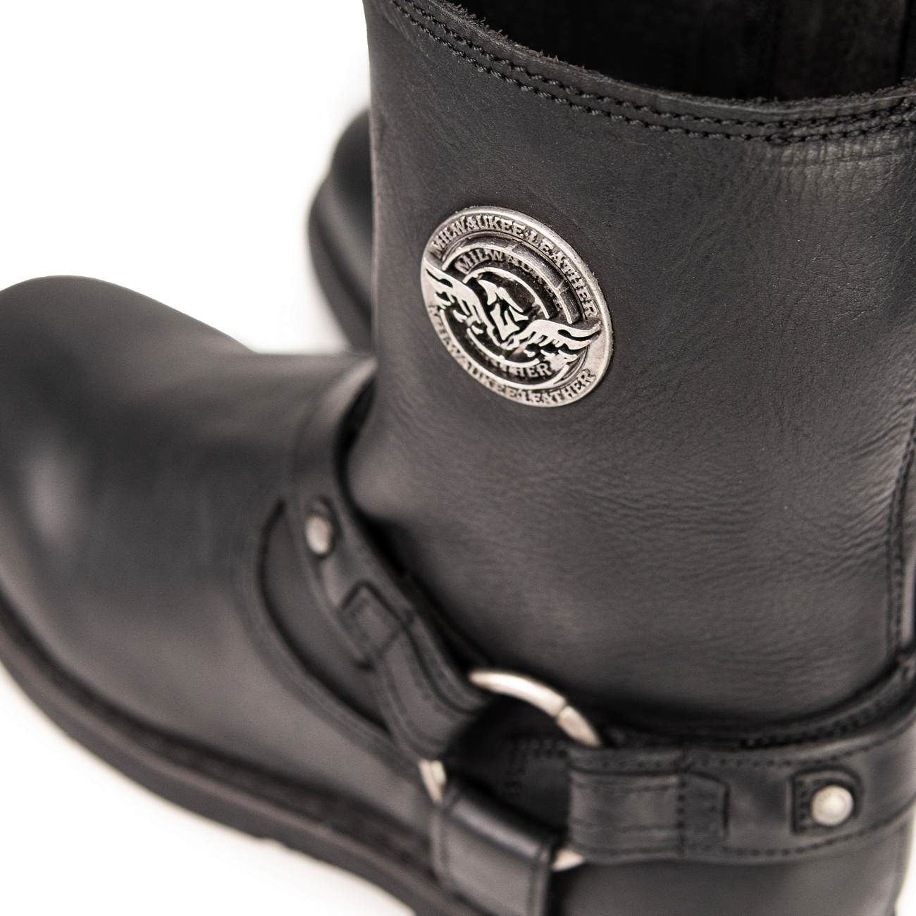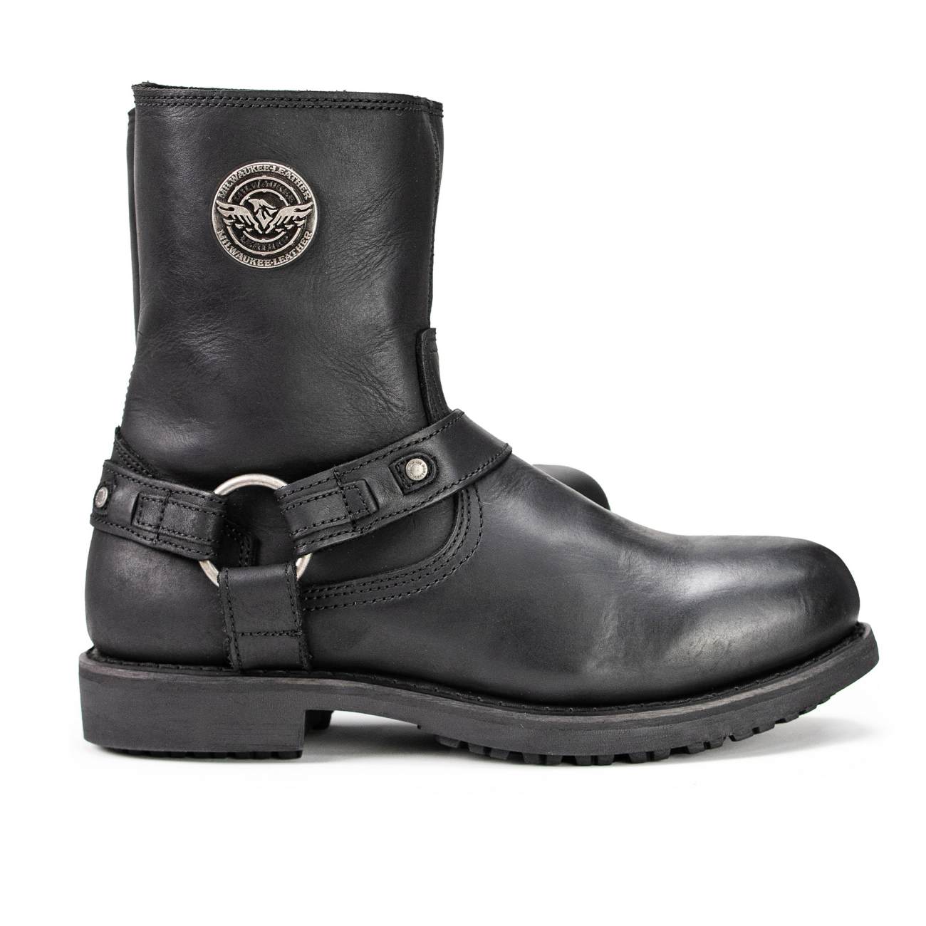 - Classic Design with Inside Zipper | These men's motorcycle boots boast a timeless harness design with a convenient inside zipper for easy wear. The boots are a short harness design with a round plain toe and feature our Milwaukee Leather Logo emblem.