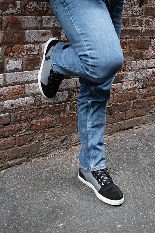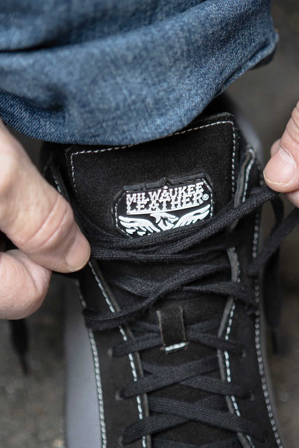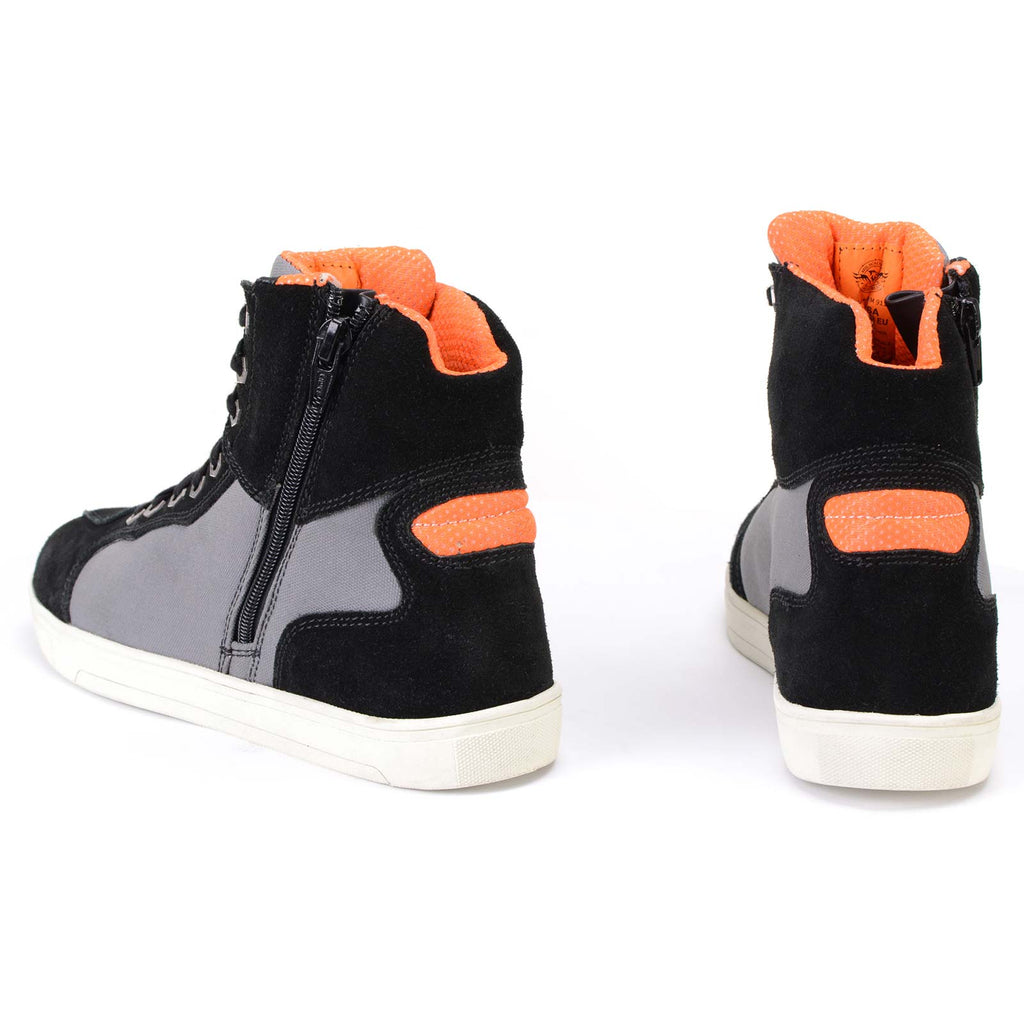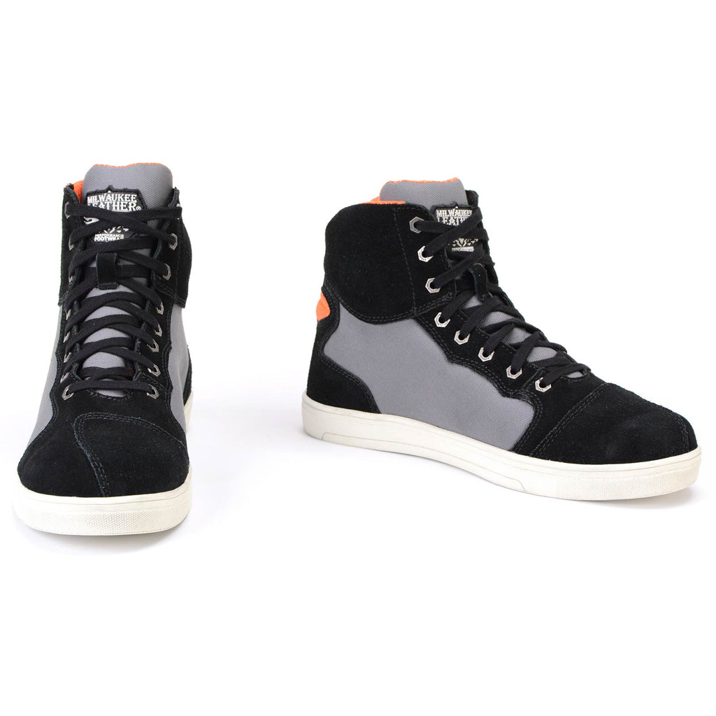 - Material | Our Milwaukee leather riding shoes are crafted from Full Grain Premium 2.2mm Thick Suede Leather and Grey Canvas Panels with an Inside Orange Mesh Liner.