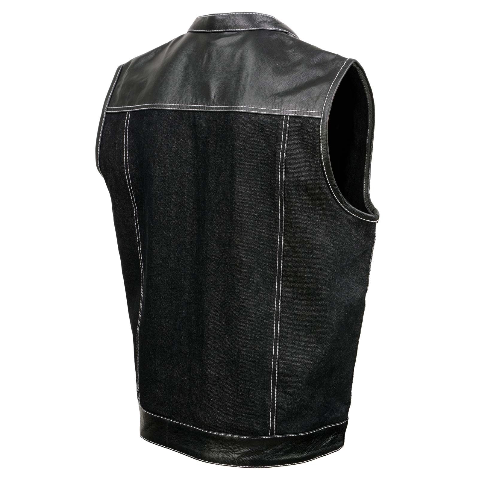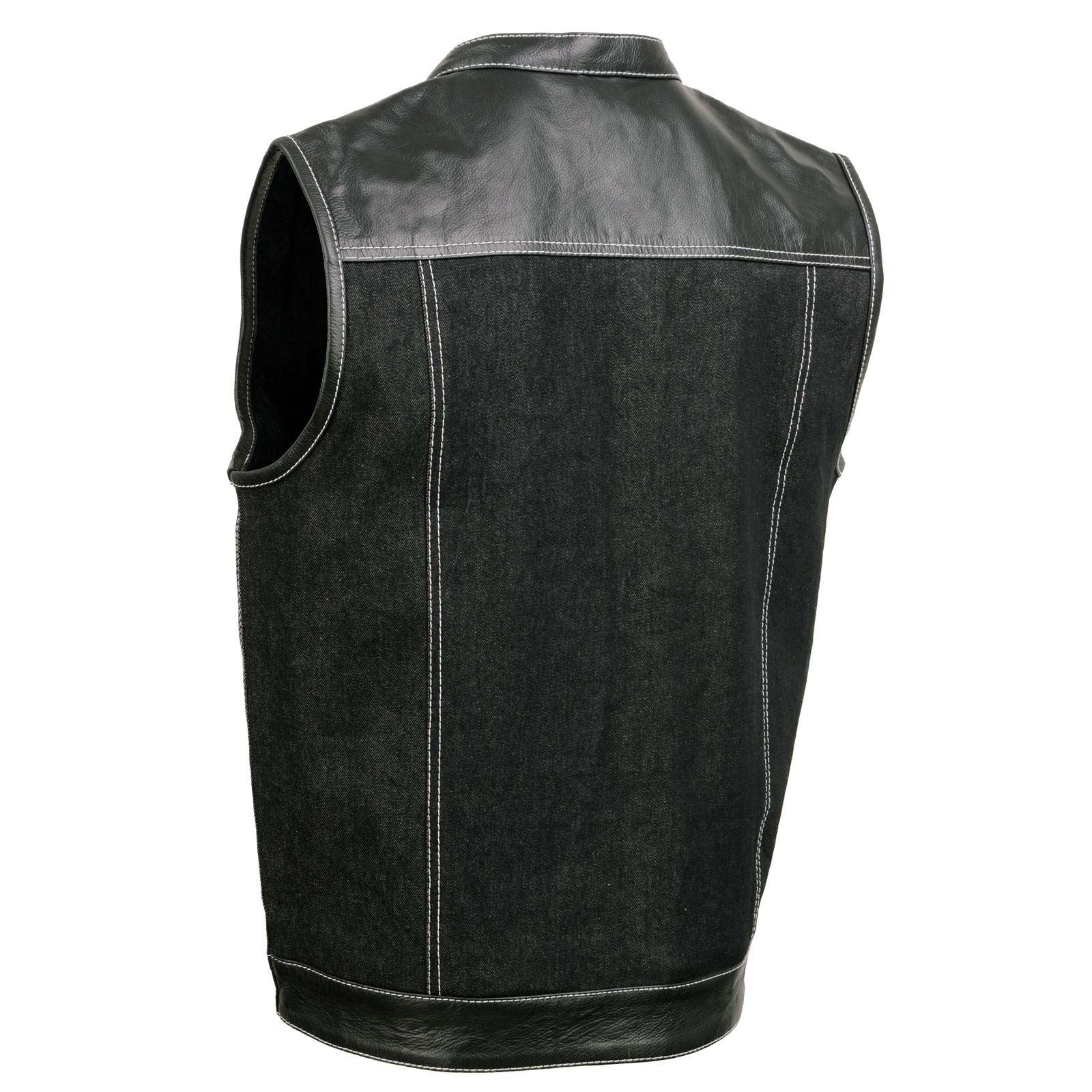 Milwaukee Leather MDM3006 Men's 'Brute' Concealed Snap Black Denim and Black Leather Club Style Vest w/ Hidden Zipper