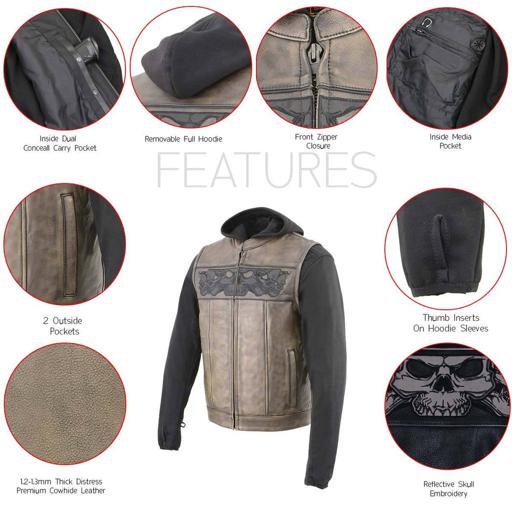Milwaukee Leather MLM3561 Men's ‘2 in 1 ‘ Distressed Brown Leather Vest with Reflective Skulls and Removable Hoodie