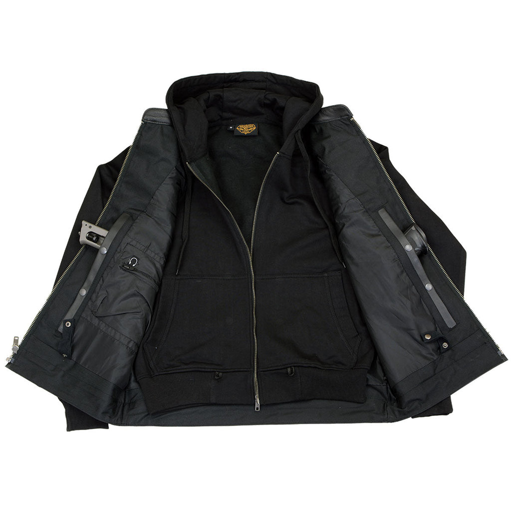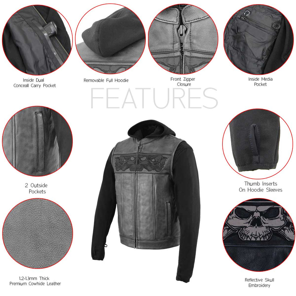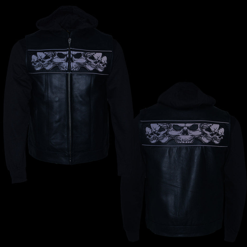 Milwaukee Leather MLM3563 Men's ‘2 in 1‘ Black Leather Vest with Reflective Skulls and Removable Hoodie