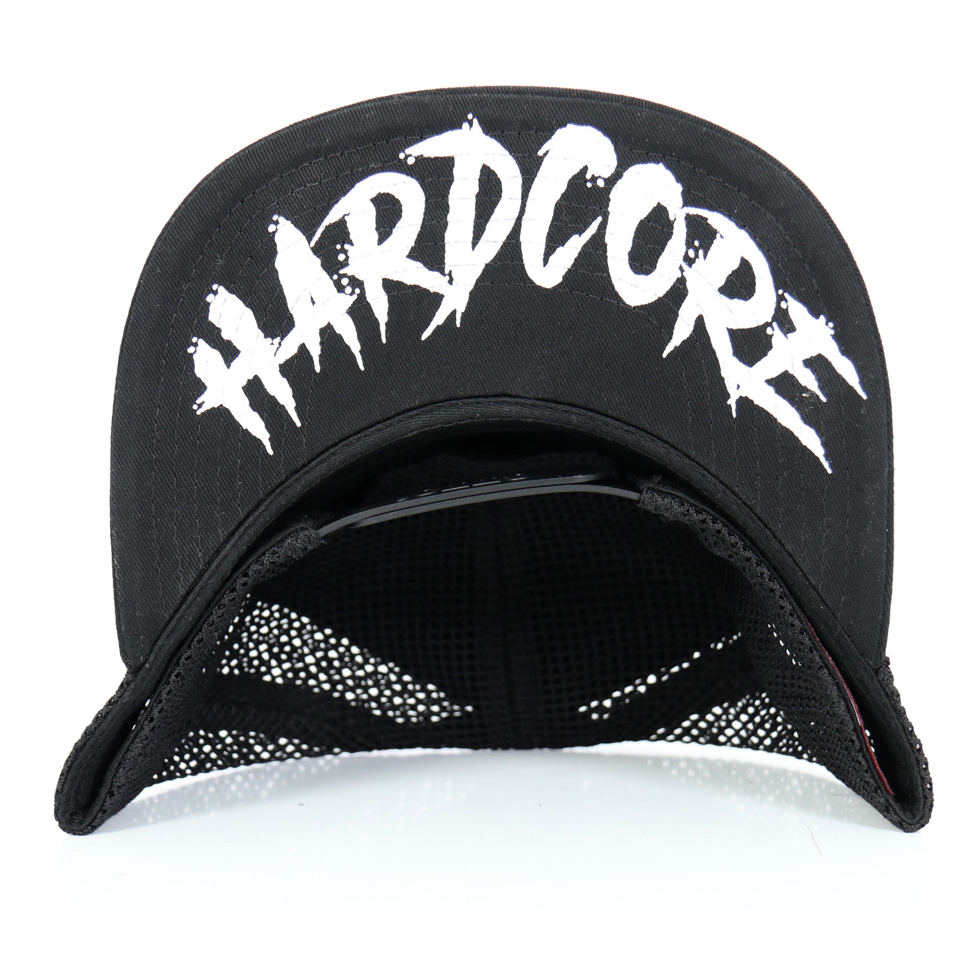 This hat features a white knuckle patch with "HARDCORE" written accross the bottom of the brim.