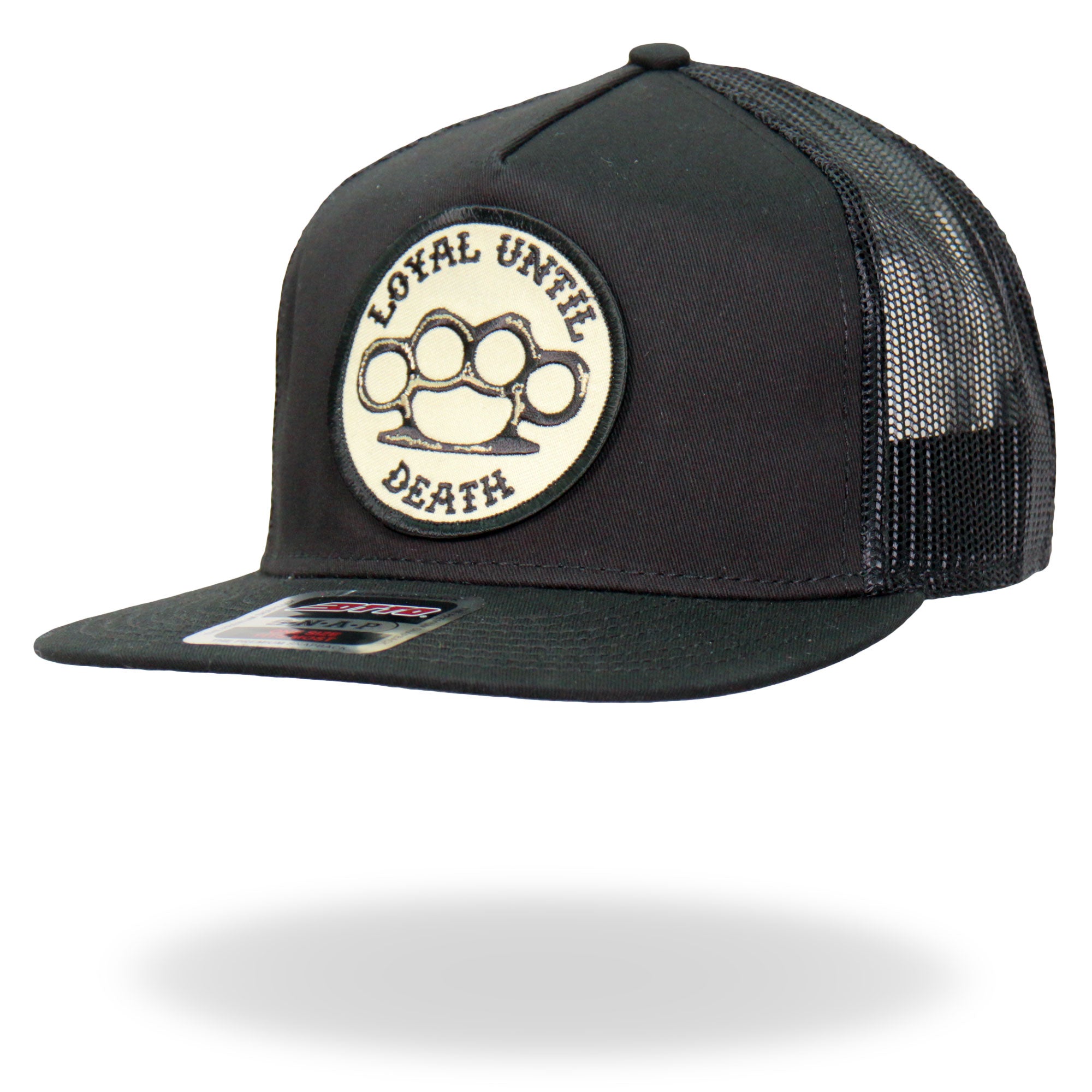 Hot Leathers Snap Back Hat. We use Otto Brand for our hat collection. This is the best snap back flat brim hat in the industry. Its a cotton/polyester blend helps the hat hold its shape for long time use. It is a mesh style back hat with a plastic adjustable tab and features a great Hot Leathers art patch.