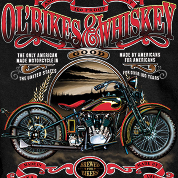 This men's printed t-shirt comes in the color black, and features a screen printed image of an antique motorcycle and reads "America's 100 Proof Finest, Ol Bikes & Whiskey.