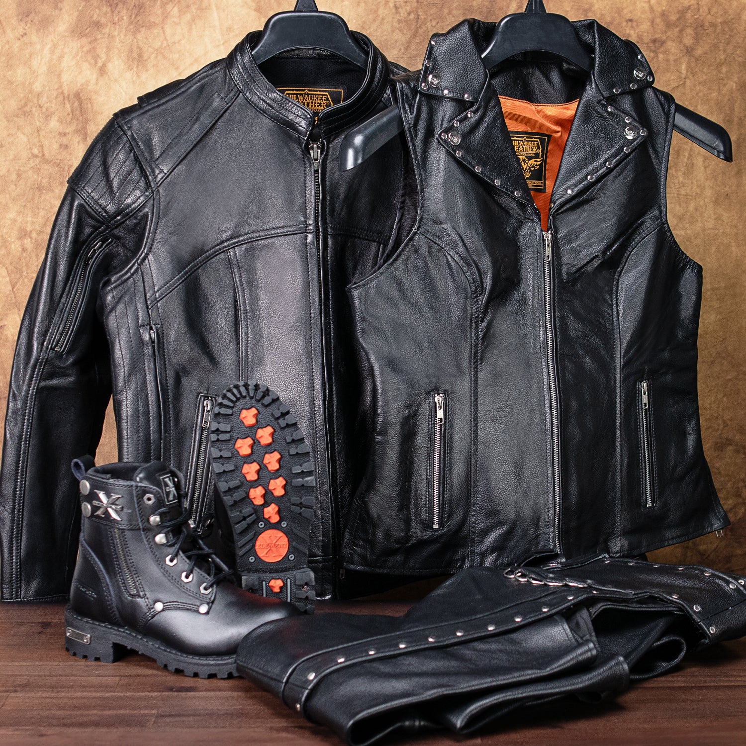 Pick 1 of each collection, a leather jacket, a vest, a pair of chaps or pants and a pair of boots.