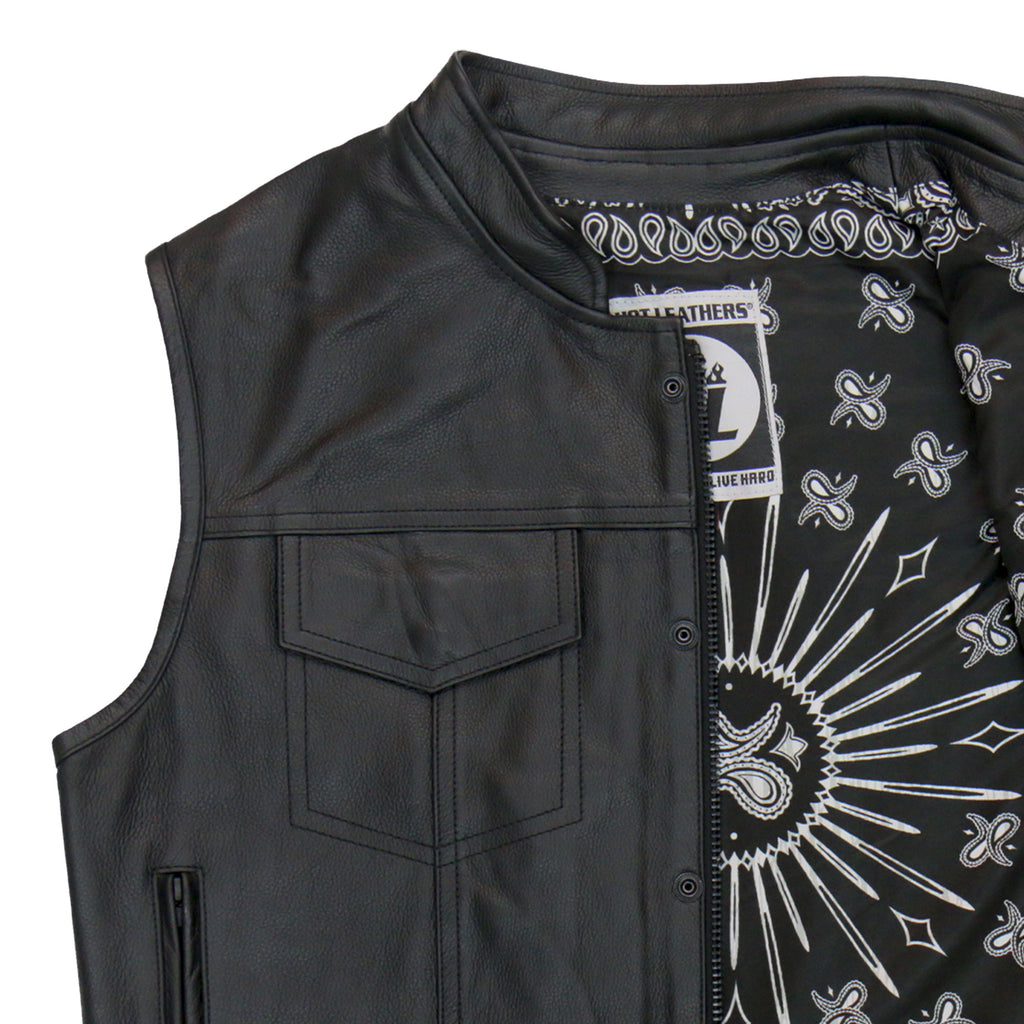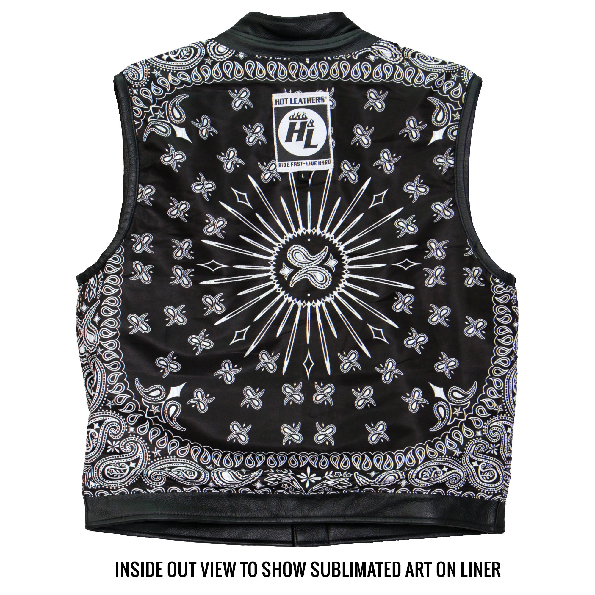 Hot Leathers is proud to announce of new collection of leather riding vests with full graphic printed lining. This Hot Leathers motorcycle club style vest is built using heavyweight cowhide, has a full zippered front and black YKK hidden snaps. This vest features a multi color polyester printed lining using the art from our classic green paisley design. This vest features four outside pockets, two carry conceal pockets and one zippered media pocket. 7 pockets! It features a one piece back with no seams which is great for stitching large patches on.