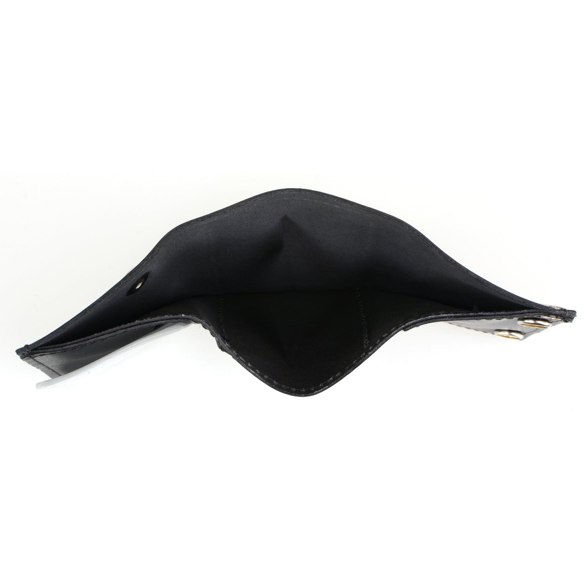 4" tri-fold wallet made of soft black leather. This American made wallet features a skeleton hand "flipping the bird", screen printed on the front. It is also designed with a detachable chain and leather belt loop snap. Show off your biker attitude with