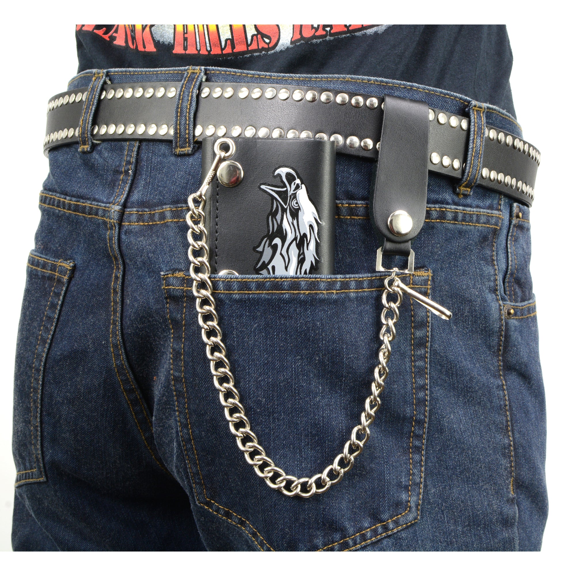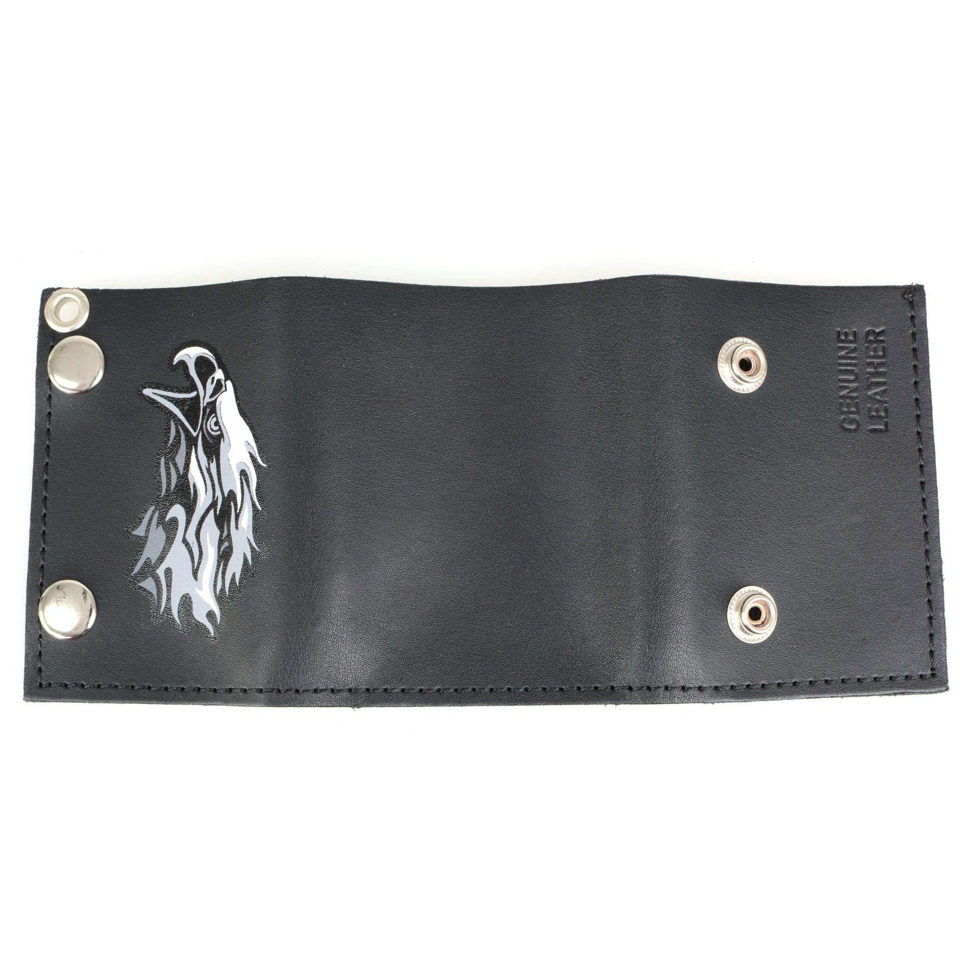 4" tri-fold wallet made of soft black leather. This American made wallet features a screen printed design of a tribal eagle on the front and includes a detachable chain with a leather belt loop snap. Upgrade your biker image with the Hot Leathers Tribal