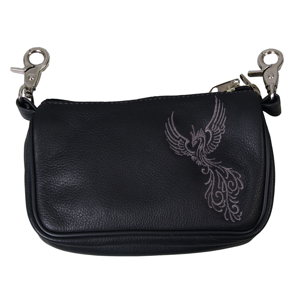 This purse/pouch has a classic look with a great embroidered tribal phoenix design. Inside are 2 pockets with sewn in ID pockets. Premium leather is used on this one for a great touch. The clips are heavy duty but not clunky to use. The adjustable strap is just the right look for a crossover.
