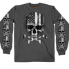 This men's long sleeve shirt in color Charcoal features a screen printed image of a faded flag skull and crossbones with 3 of the same skulls running alongside t