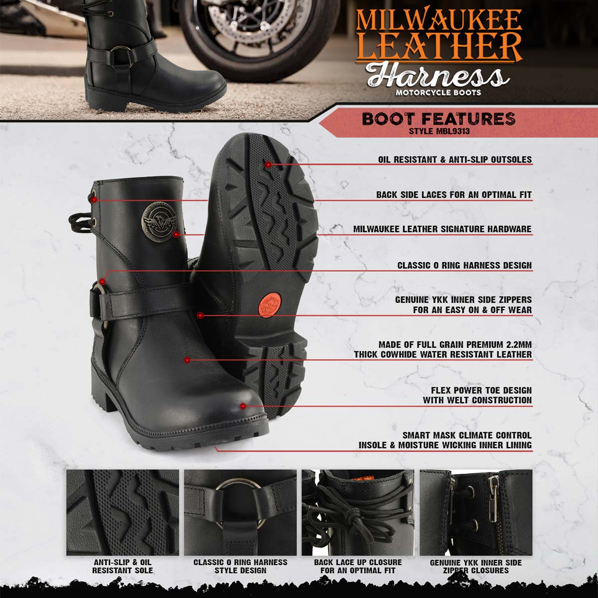- Inside Zipper Closure with Adjustable Back Laces | These classic motorcycle boots for women feature a secure closure system with an inside side zipper for easy on and off wear, allowing you to easily put them on and ensure a secure fit for a confident bike ride. Adjustable back laces for an optimal snug fit. The women's riding boots boast the industry’s best YKK hardware, bearing Milwaukee’s Leather signature logo, along with a classic O-ring design.